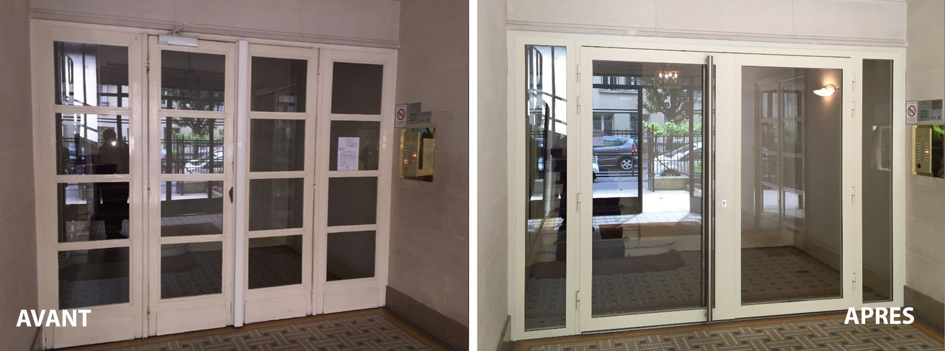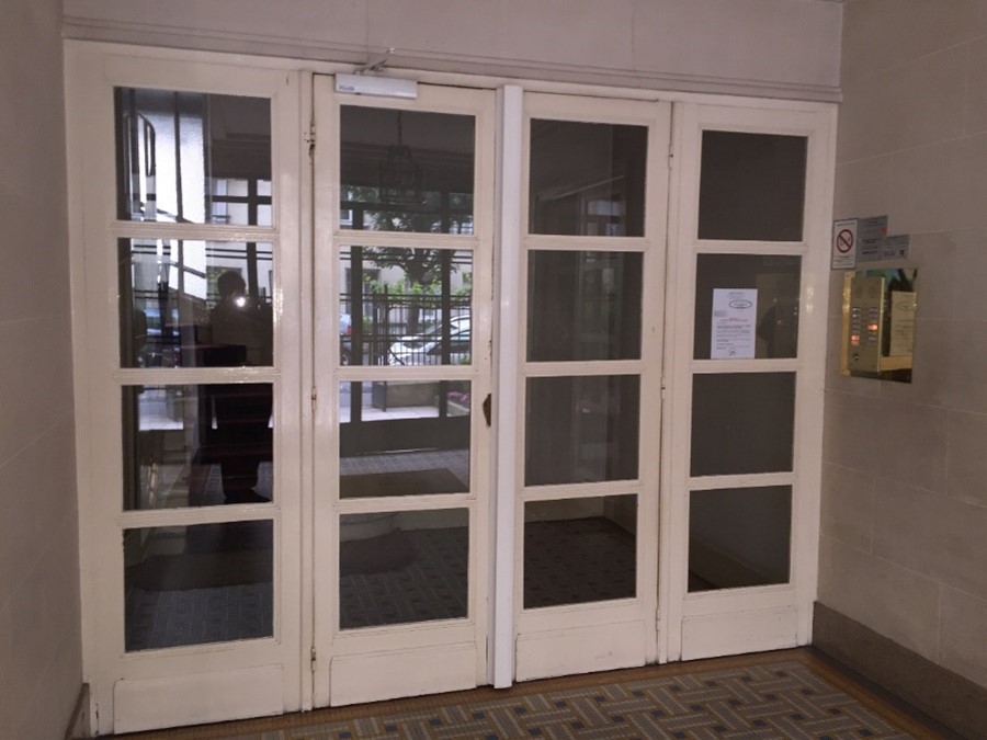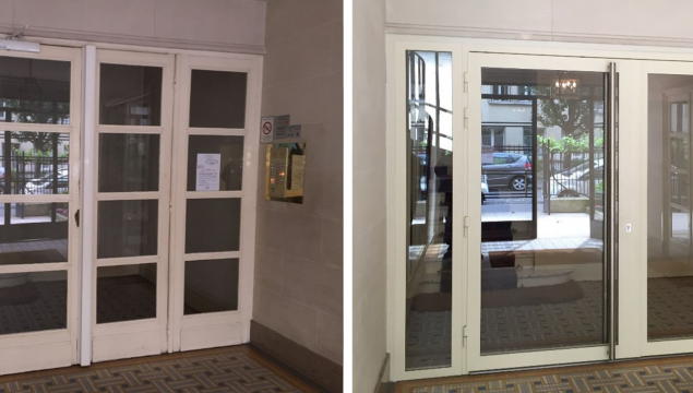 Dépose de porte en bois non sécurisés puis mise en place de porte métallique vitrée avec vitrage anti-effraction et système de fermeture par ventouses électromagnétiques.